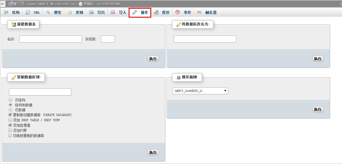 4、 數據庫“操作”功能,提供添加表、重命名表、復制的功能。如下圖: