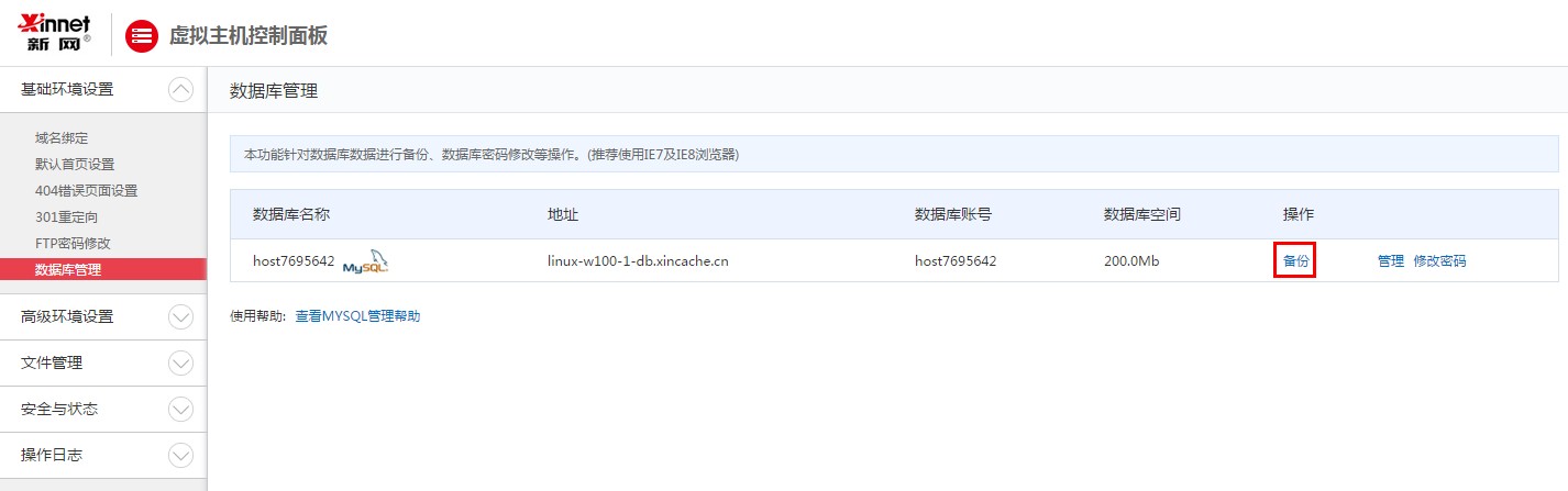 1、 當您進入虛擬主機控制面板,點擊“管理”,可以登錄至phpMyAdmin的首頁,在此頁面中您可以對您的數據庫進行管理。
